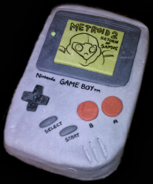 But lo, Adam drew a perfect Kirby screen shot and decided that no, wait, Kirby is a dick – Samus is where it’s at. He then created a fondant game cartridge to solidify his change of heart.